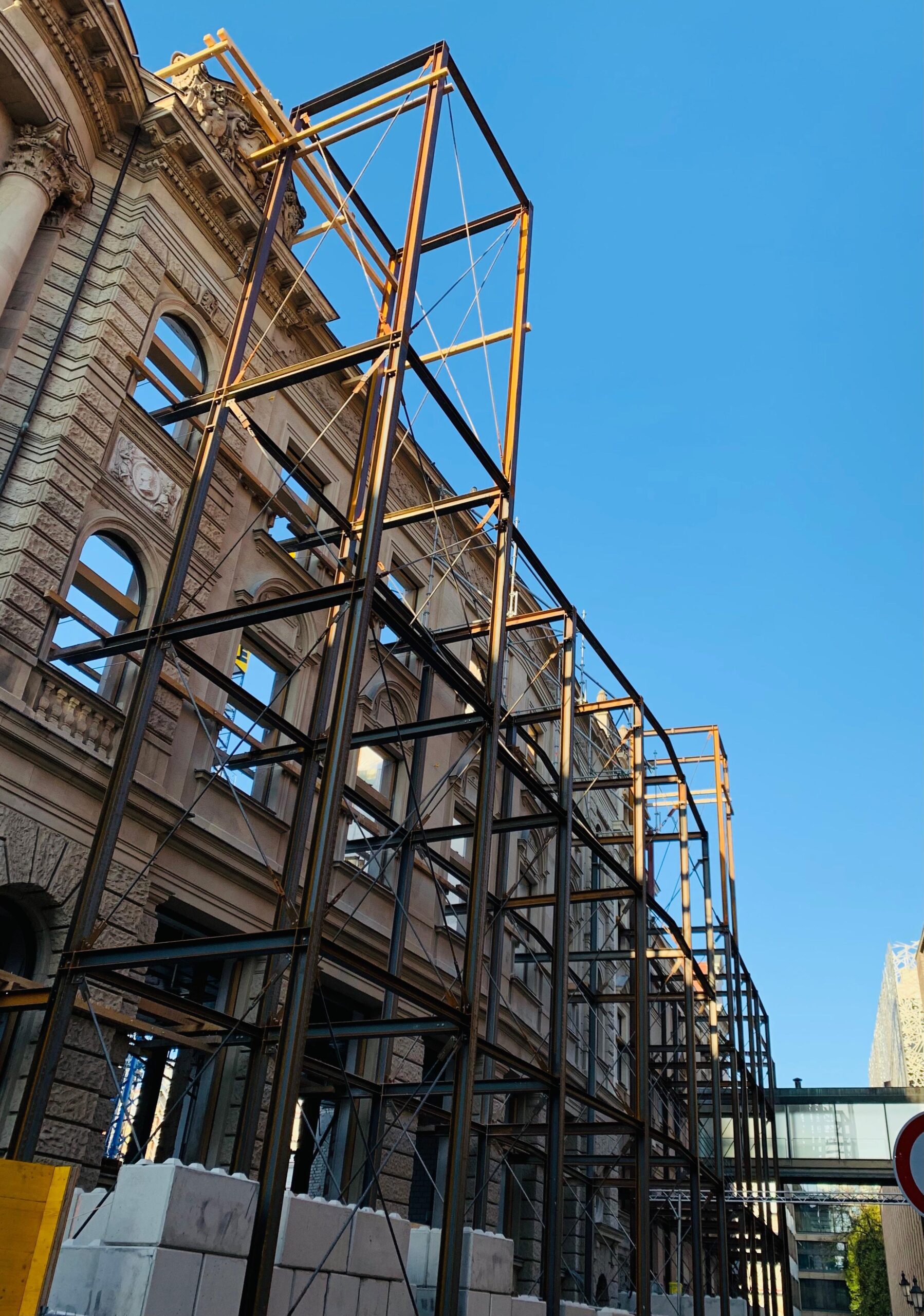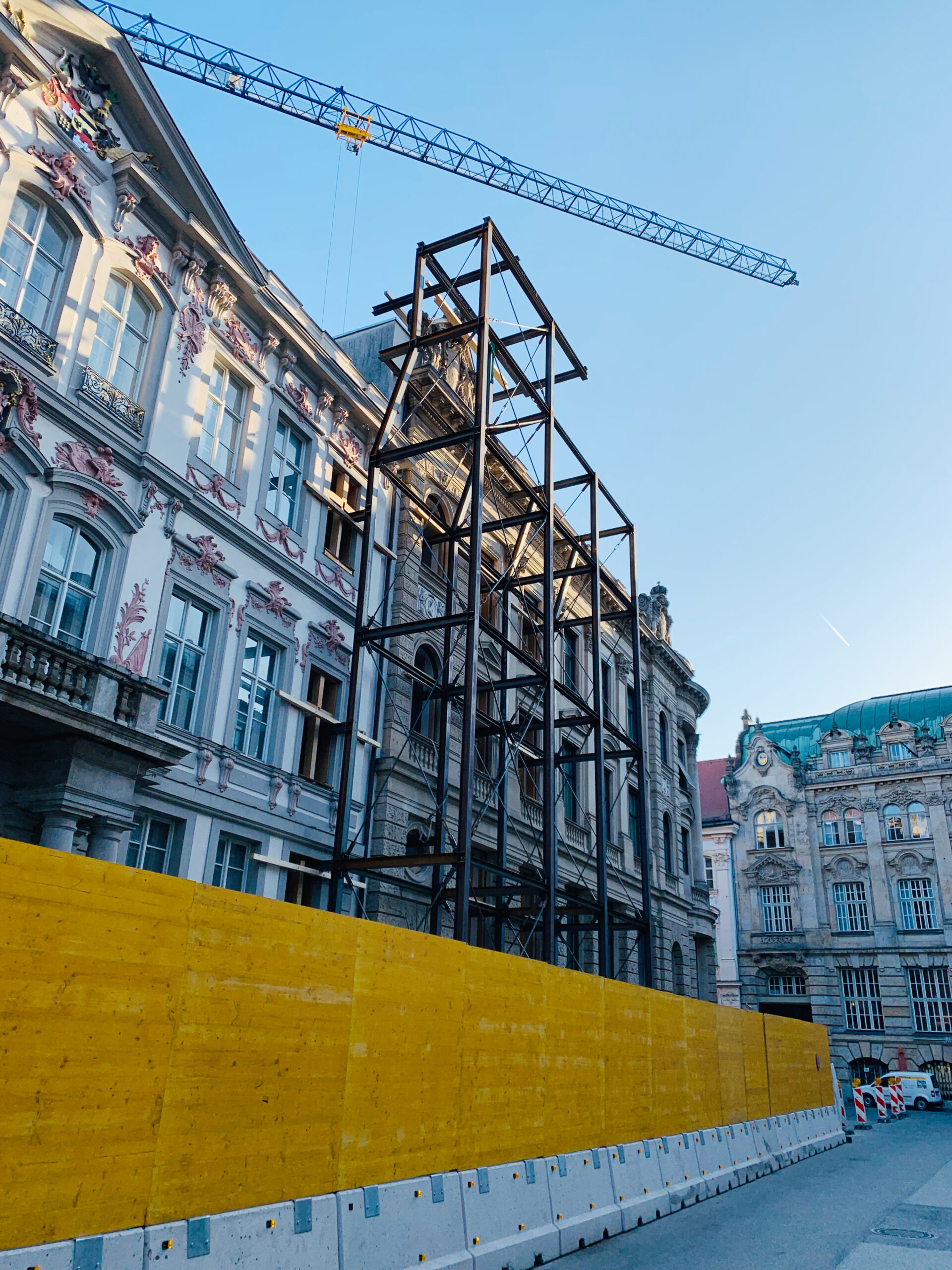 Bei der Sanierung eines Gebäudes in der Kardinal-Faulhaber-Straße in München standen wir vor einer besonderen Herausforderung: Die Fassade sollte während der gesamten Bauphase komplett freistehend bleiben.