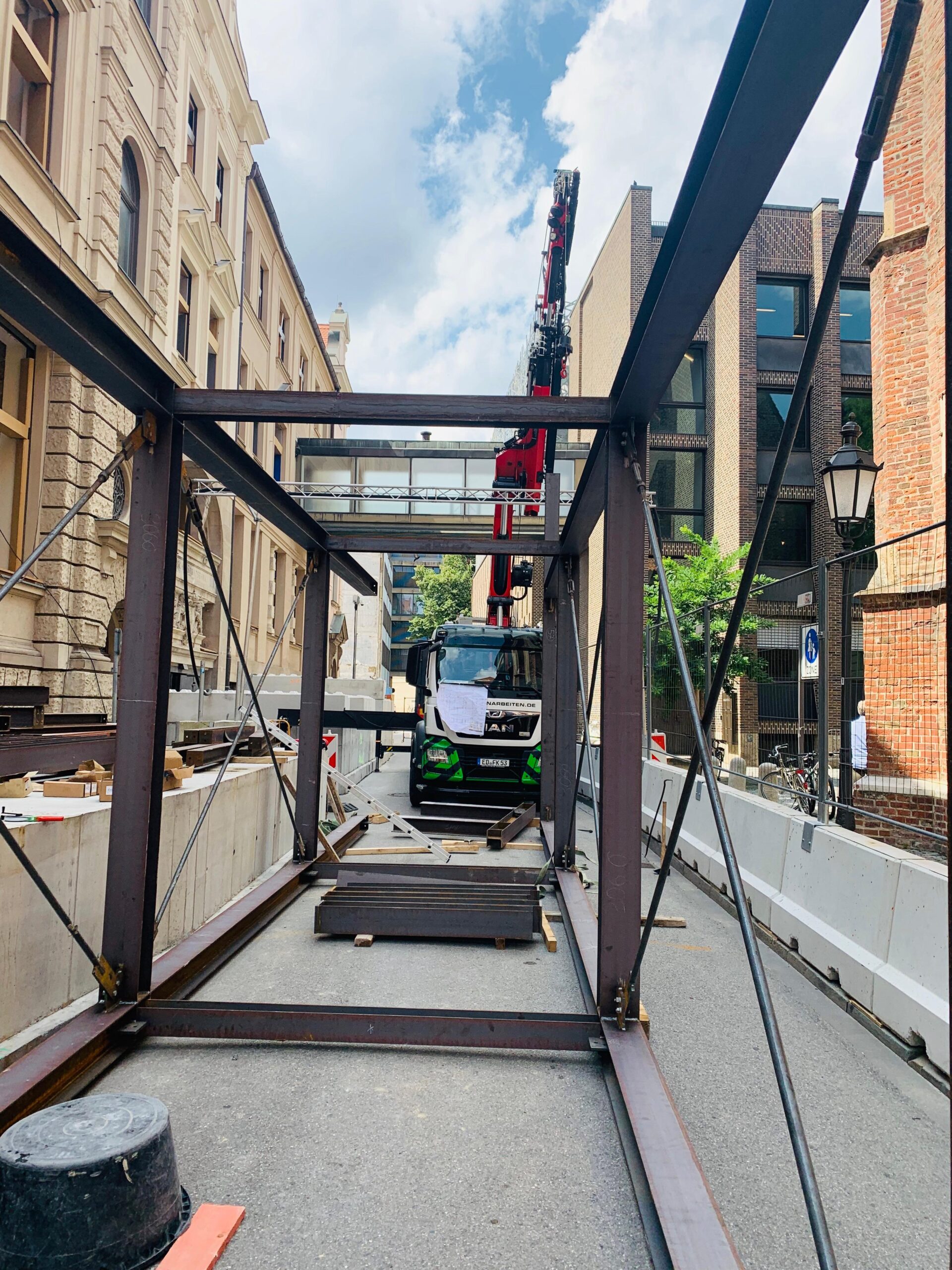 Da sich diese Anforderung mit Standard-Gerüstbauteilen technisch wie wirtschaftlich nicht realisieren ließ, entwickelten wir eine maßgeschneiderte Lösung. Gemeinsam mit unserem technischen Büro planten und fertigten wir mehrere Traggerüste in robuster Stahlbauausführung. So konnten wir die Fassade effizient und zugleich wirtschaftlich sichern und den Baufortschritt optimal unterstützen.