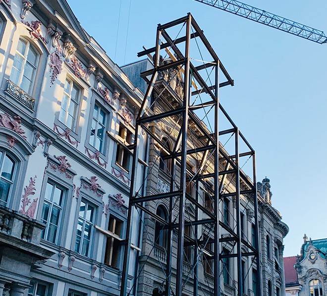 Bei der Sanierung eines Gebäudes in der Kardinal-Faulhaber-Straße in München standen wir vor einer besonderen Herausforderung: Die Fassade sollte während der gesamten Bauphase komplett freistehend bleiben.